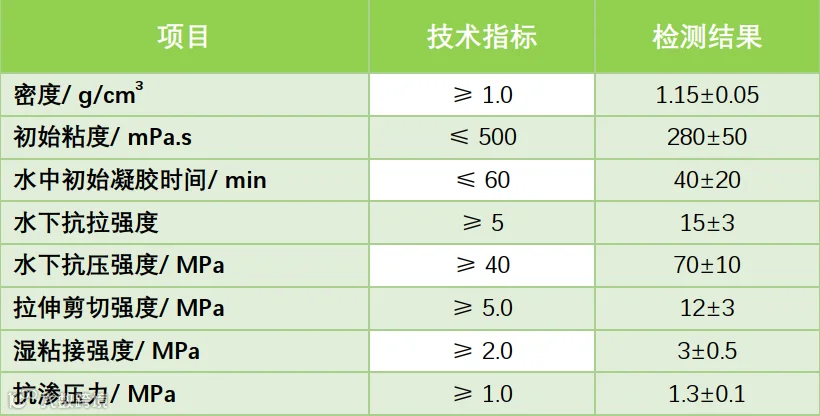 ●水中固化速度快。水下初凝时间<60 min,可调至20 min。