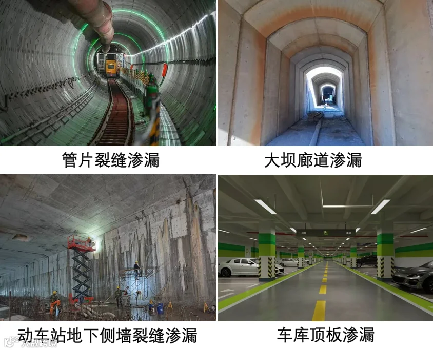 ●隧道、地铁、地下室、人防、水库大坝、巷道等有较大漏水点的部位。
