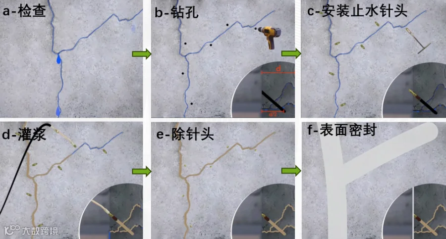 混凝土裂缝的产生为O2、CO2和水等物质侵入混凝土内部提供了途径,进而导致水泥基材料的劣化和钢筋的锈蚀。特别是在地下工程中,由于基础设施长期处于地下水循环之中,地下水对混凝土结构的侵蚀和劣化尤为严重且难以根治。因此,及时对混凝土裂缝进行堵漏和修复,成为保障建筑结构安全运营的必要措施。