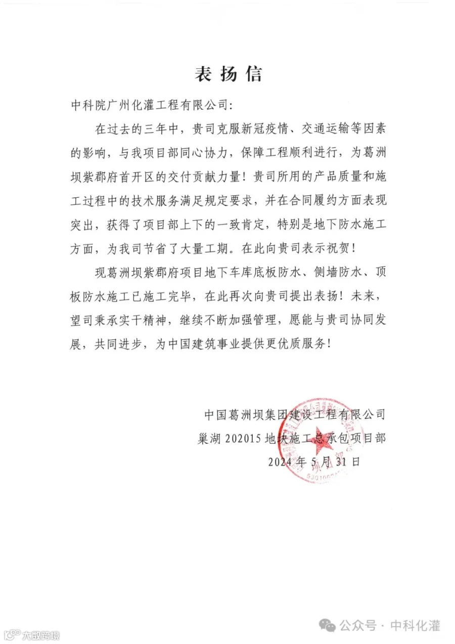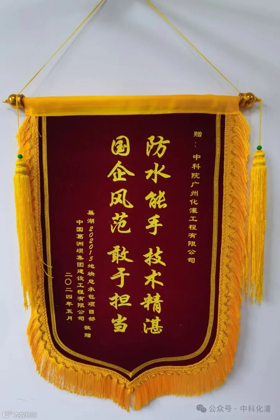 6月4日,中国葛洲坝集团建设工程有限公司巢湖202015地块施工总承包项目部将一面写有“防水能手 技术精湛,国企风范 敢于担当”的锦旗与一封表扬信送至中科院广州化灌工程有限公司(化灌公司),对化灌公司在巢湖202015地块防水工程项目中的精湛施工、高效管理、优质服务及担当精神表示肯定及感谢。