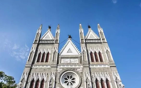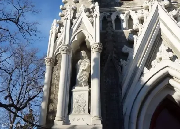 它是典型的哥特式建筑,四个高高的尖塔,三个尖拱券入口及主跨正中圆形的玫瑰花窗,塑造出端庄而绮丽的立面,在青松翠柏环绕之中越发显得洁白挺拔。