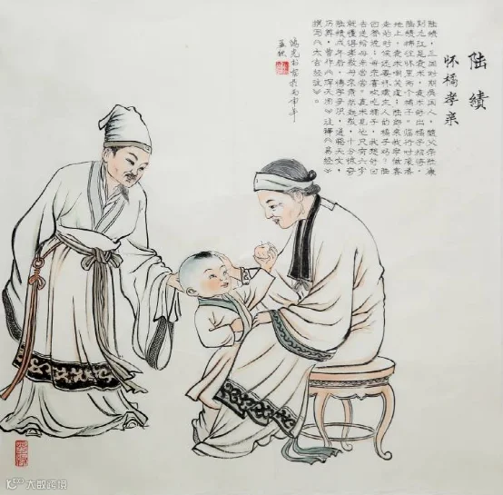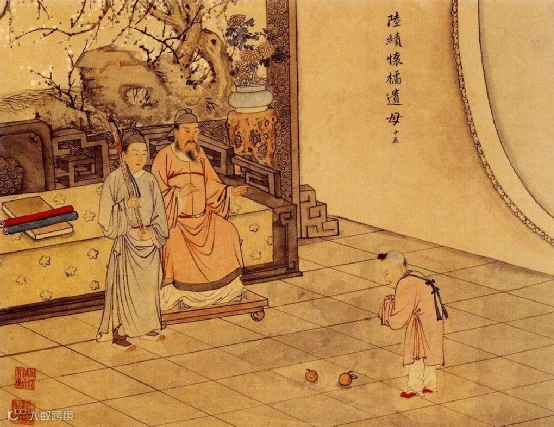 陆绩,字公纪,三国时期江南华亭(今上海市)人。六岁的时候,父亲因事赴九江谒见袁术,陆绩随父前往。袁术见他聪明俊秀,应对敏捷,说话得体,十分喜爱,抚摸着陆绩的头,对他的父亲说:“这个小儿秀外慧中,很聪明,日后一定会以文章扬名于世。”于是命身边的人拿山丹橘给他吃。陆绩见袁术赏赐给他的丹橘形状、颜色皆与寻常所见不同,心想母亲平常喜爱吃橘子,可是却没有好的橘子可吃,于是就拿了几个揣在怀里,准备回去后让母亲尝尝,等到起身告辞的时候,怀里的橘子不小心掉落地上。其父见状十分尴尬。袁术笑着问道:“小孩子来做客为何偷橘子呢?” 陆绩说:“我的母亲平日最爱吃橘子,今天见将军赏赐的橘予形状、颜色比平时见到的要好,所以就揣起来几个,回家奉献给母亲,一同领受将军的赏赐。”听了这话,袁术和身边的人没有一个不称赞的。陆绩后来在吴国做官。官至郁林太守。他因博学多才而享名于世,天文历算无不精通。作有《浑天图》,为《周易》作注,解释《太玄》,皆有精当之见。这些书都流传于世。