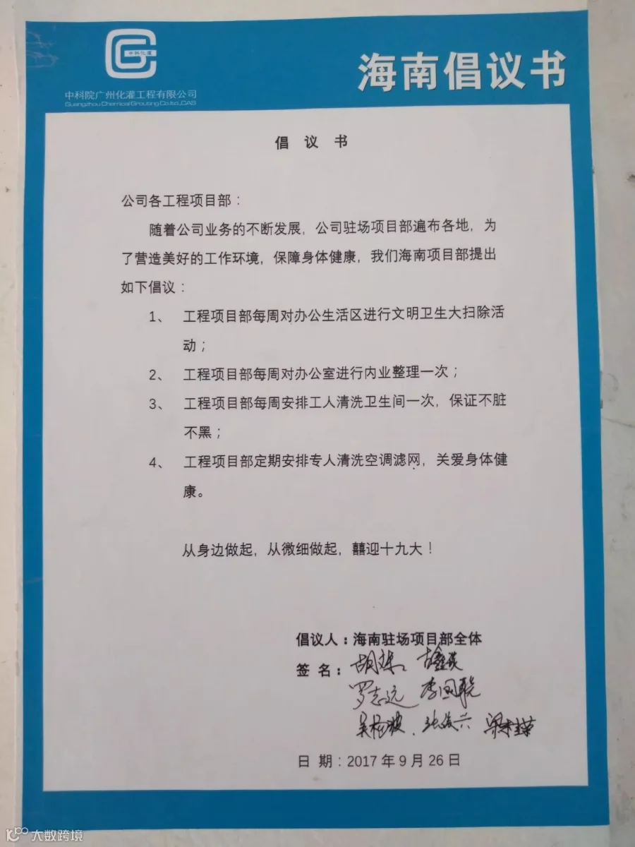 胡文东还在学习交流会上以海南生态软件园首开区桩基工程项目部办公室环境卫生倡议书为典范,以佛山五矿地产奇槎项目部办公室布置为模板,要求各项目部要加强办公环境及布置整治,营造一个舒适、安全、文明的办公环境,对外树立公司良好的品牌形象。