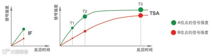 TSA:HRP酶促反应在线性期内(0~T2)可持续活化1 0-1 000个荧光分子,反应最终饱和,进入平台期(T2-T3)。平台期之后,不同位点之间信号的差异会被逐渐拉平。