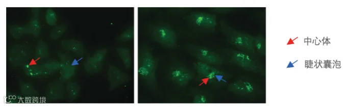 以CEP1 64的表达为例:CEP1 64在细胞中心体中高表达,在睫状囊泡中低表达,但在TSA标记过程中,过长反应时间(1 5 min)缩小了这种差异,让睫状囊泡中的信号看起来和中心体一样强。