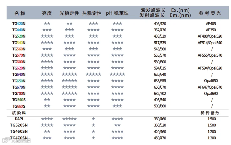 包含50μL染料3支和100μL核染料1支(TG520N、TG620N、TG670N、DAPI)、显色缓冲液1瓶 |