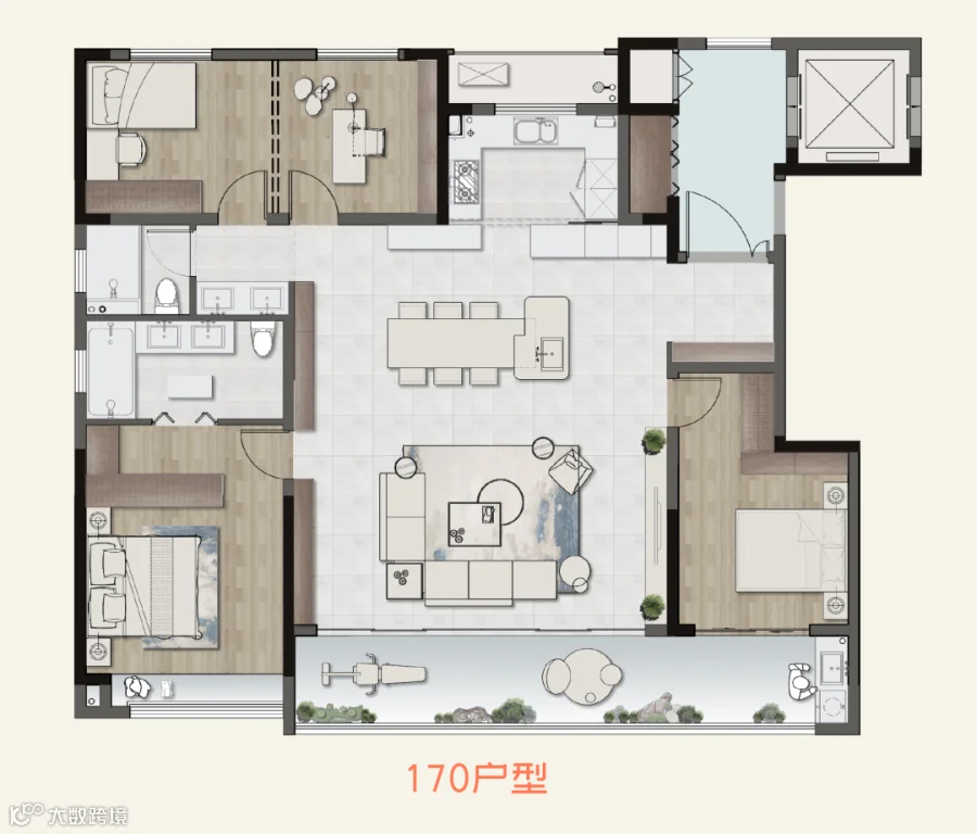中梁探索室内公共空间极限,以S⁺170户型为例,中心聚合厅面积约76㎡,占总面积三分之一以上。超大尺度淡化空间边界感,消除家庭社交隔阂,满足不同家庭及成员间的社交和娱乐需求,建立家庭休闲、交流中心,重建家庭亲密关系。