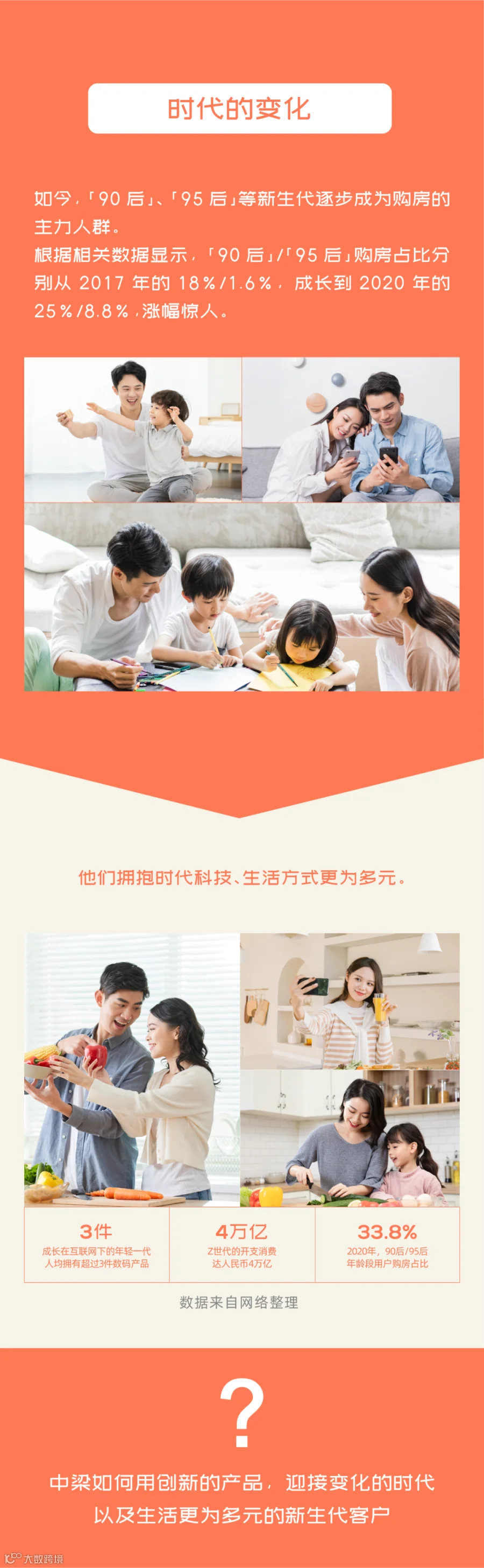 通过入户拜访、调研访谈、数据报告分析等多种调研方式,中梁发现,物质富足、信息爆炸的新生代人群,在当今多元文化的熏陶下,衍生出颜值控、懒宅族、剁手党……等拥有多样“人设”的群体。