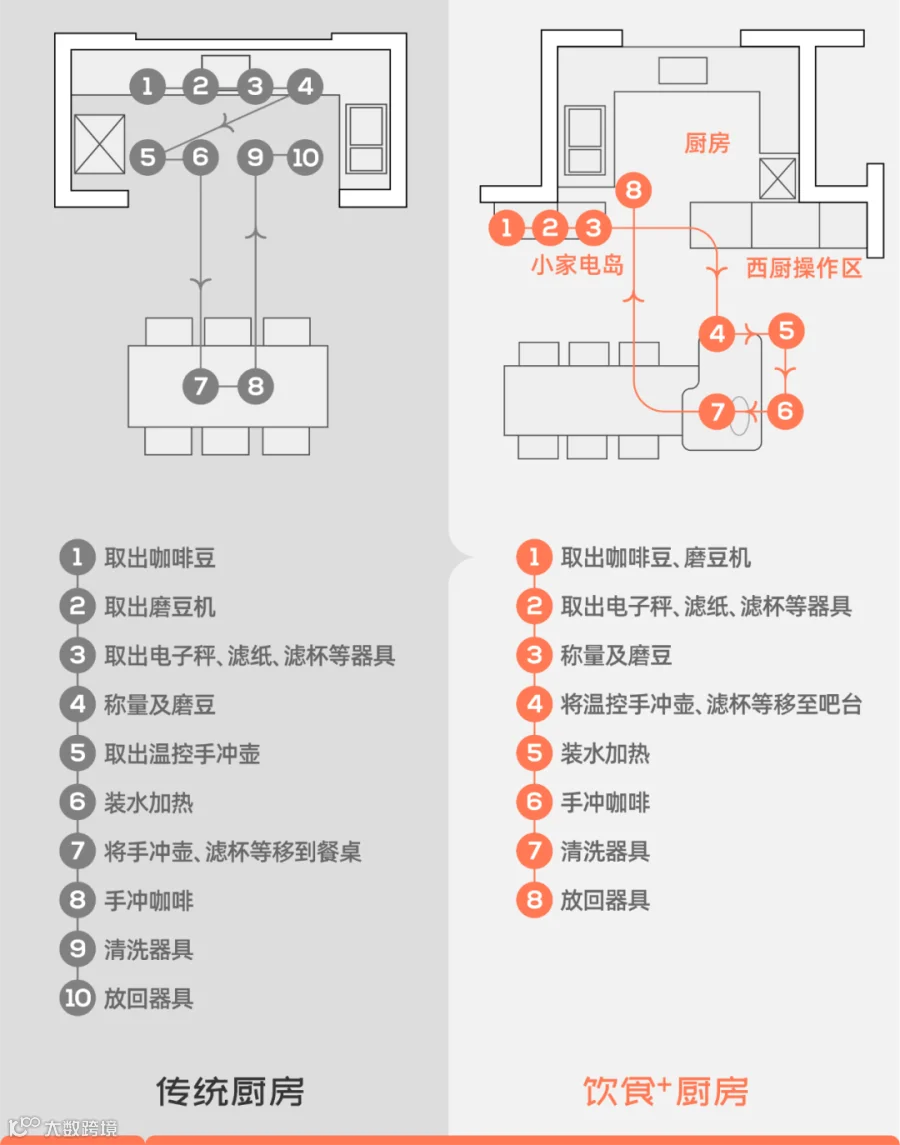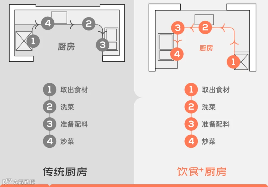 以常见的炒青菜为例,通过动线优化,烹饪者移动距离由过去的2.7m到1.9m,效率提升42%!