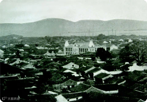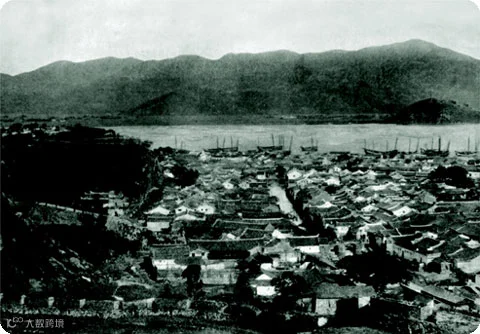 这是惟一一张较为完整的温州旧城老照片,大抵可以看出100年前温州的城市格局。照片中近景为还保存的非常完好的老城墙,中景为密集的民居、泊在江边的帆船,连江北岸的双塔亦清晰可辨。
