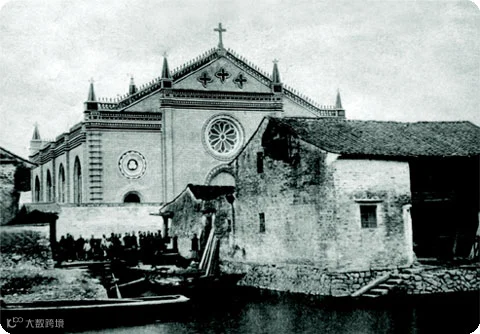 城西大教堂在今鹿城区城西街78号,始建于1878年,后遭焚毁。现今的教堂重建于1898年,建筑面积1450平方米。坐西朝东,前为大堂即礼拜堂,后为小堂即福音堂,另有中式用房12间。大堂为中世纪哥特式建筑,是温州市规模最为宏伟的基督教堂。该照片摄于上世纪初,当时教堂的正前方是一个小码头,现在的城西街还不存在。