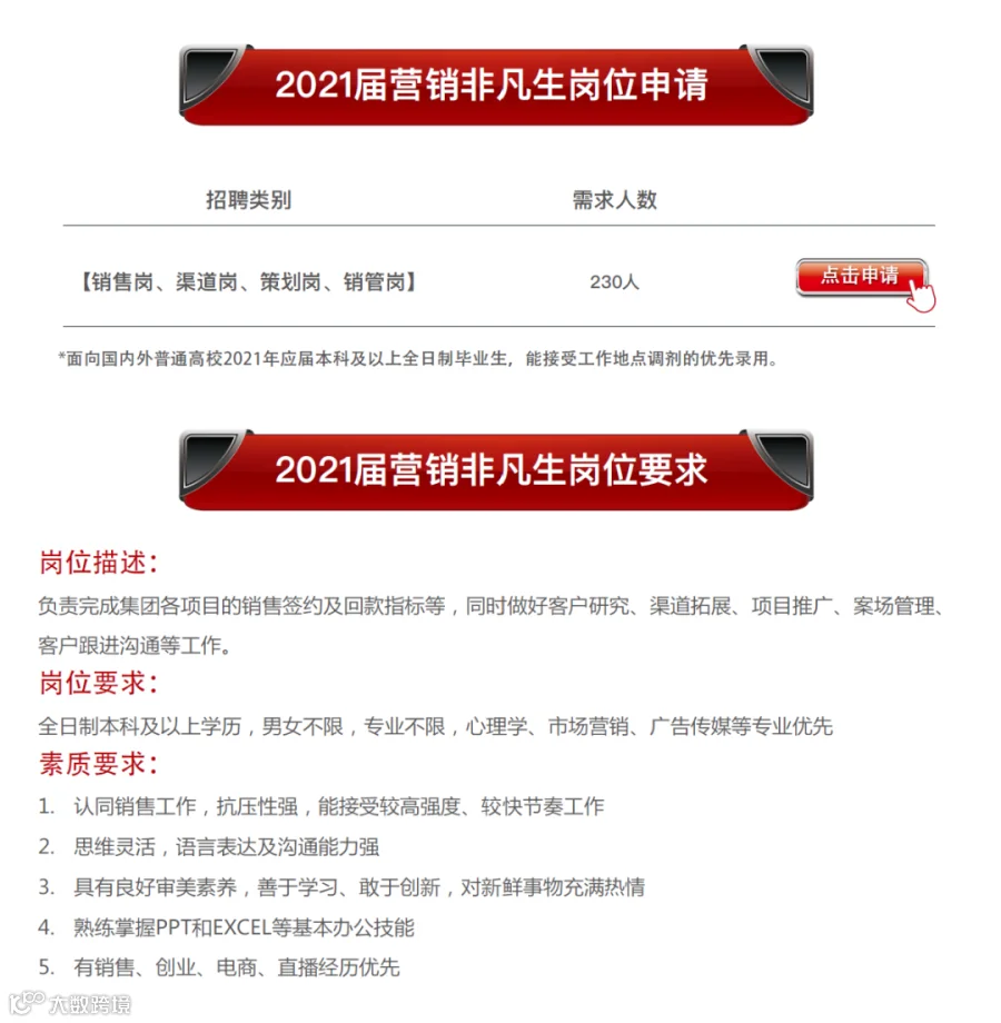 2021届“非凡”计划拟在国内外院校招募230名热爱营销事业、有野心、敢想敢干、为命运而战的优秀应届毕业生。通过2-10年的系统培养,打造成为中梁未来的区域集团总裁、联盟中心执行总裁、区域公司董事长、营销总等一大批高素质经营人才。