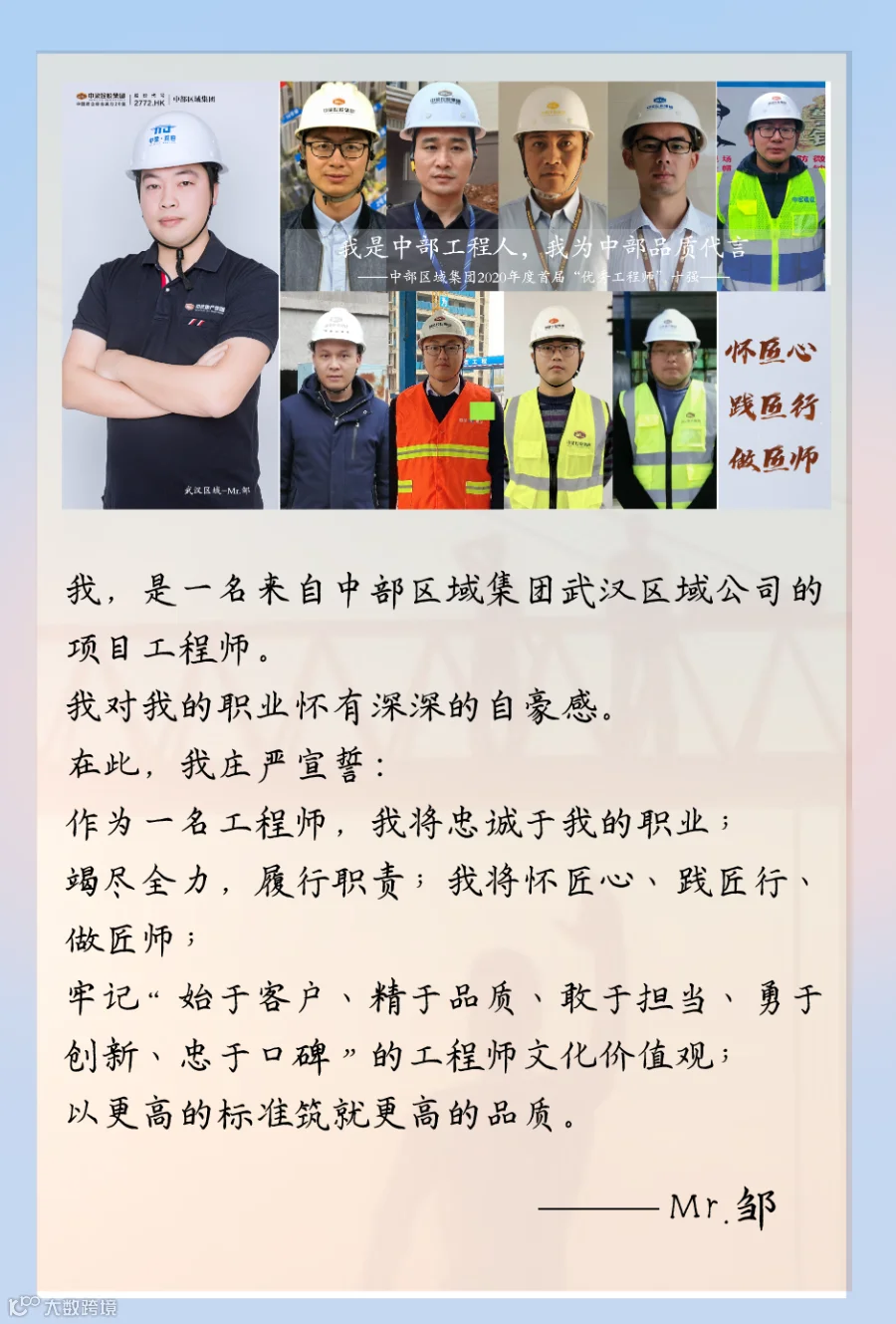 无论行至何方,希望我们都能在坚守践行“始于客户、精于品质、敢于担当、勇于创新、忠于口碑”的工程师文化道路上砥砺前行,牢记匠心匠行的中部工程文化价值观,以更高的标准筑就更高的品质。