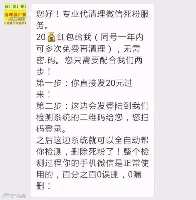 接着,他们用脚本开始批量对好友发布清理僵尸粉消息,用外挂测试收到消息的好友里有谁删除拉黑屏蔽。于是,你的好友就会接到这种消息了: