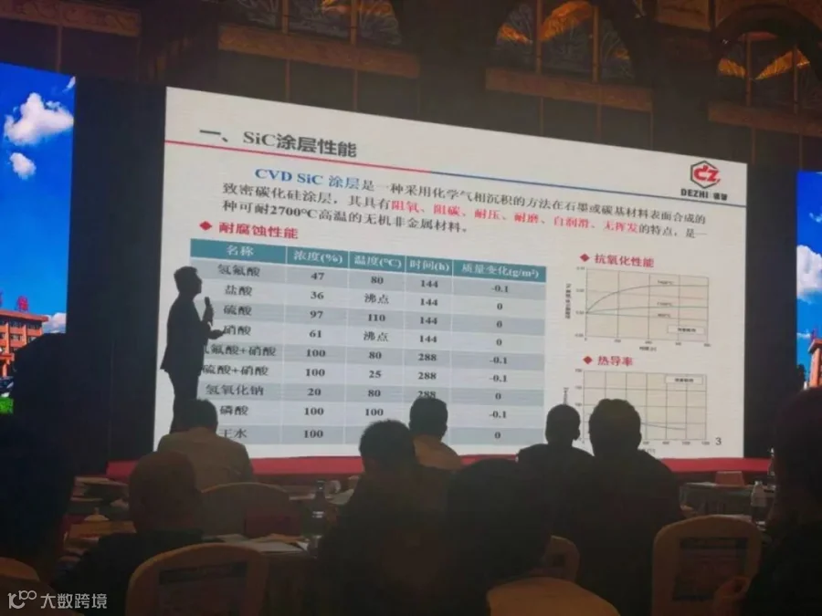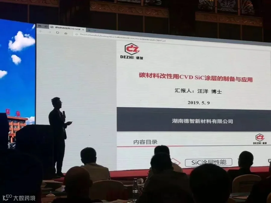 会议中,德智新材研发部技术总监汪洋博士就《碳材料改性用致密SiC涂层的制备与应用》做了专题汇报,详细介绍了德智新材SiC涂层性能、制备原理及应用方面。与涂刷法、热喷涂工艺相比,德智新材采用化学气相沉积工艺所制备的SiC涂层具有纯净度高、致密性好、均匀性高、结合力强等优势,能更好地利用SiC涂层阻碳、高纯、耐高温、抗氧化等特性保护内部基体。报告获得了参会代表的高度认可,相关行业企业代表均表达了浓厚的兴趣。