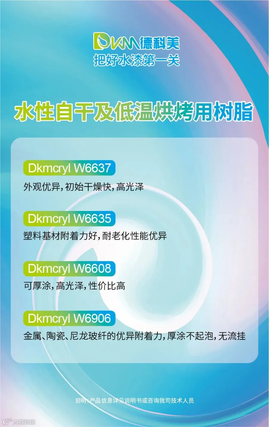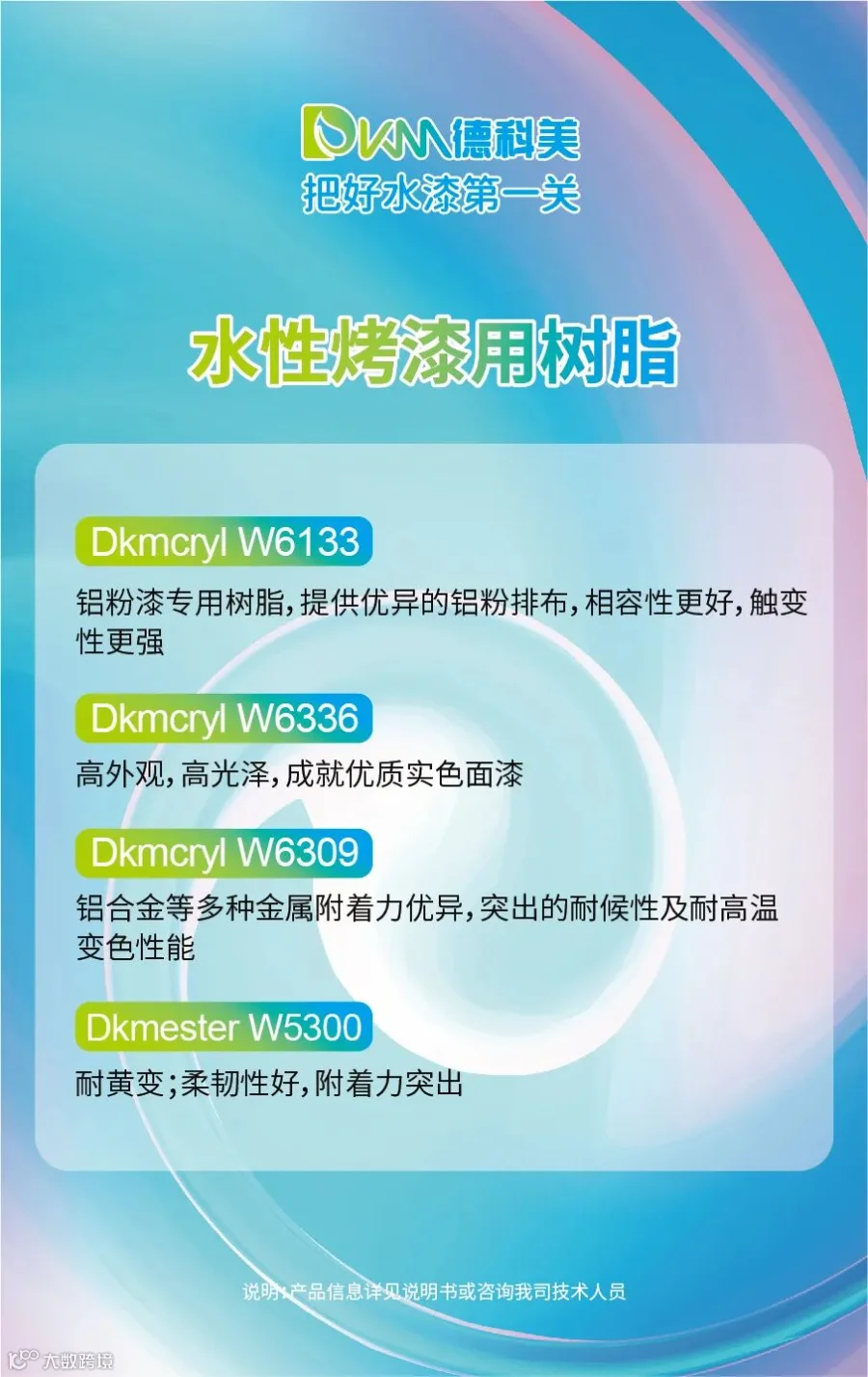 本次涂料展,德科美推出了水性烤漆用树脂、水性自干及低温烘烤用树脂及水性固化剂三大类型产品。
