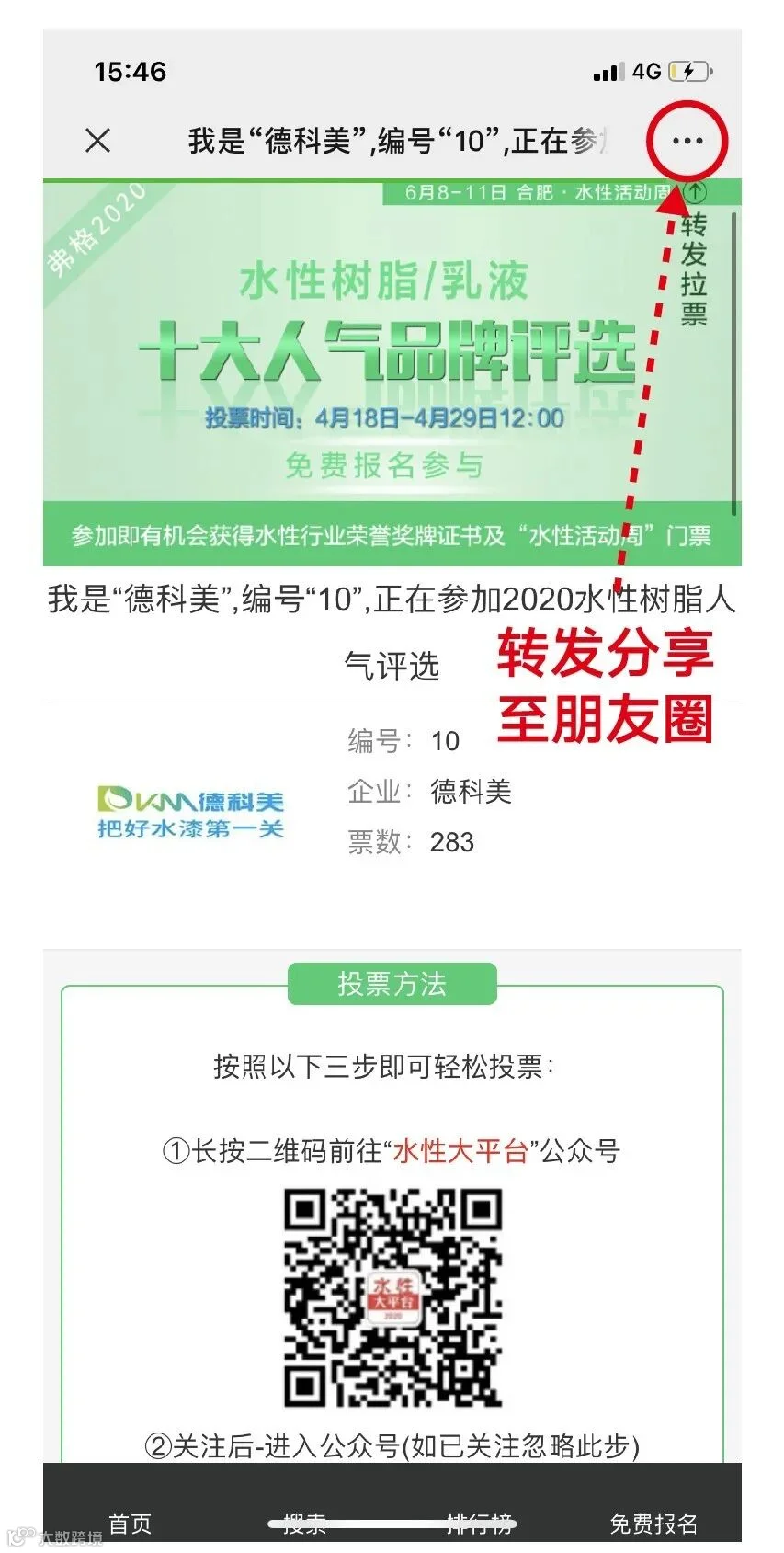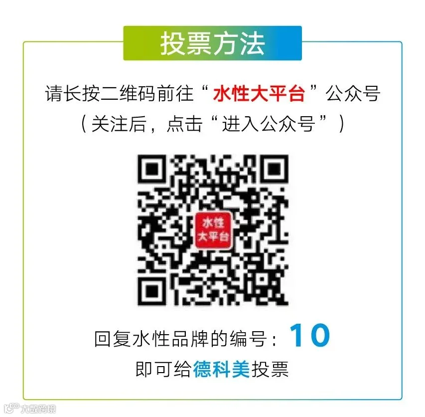 2020水性行业品牌评选活动现已启动,德科美此次参与“水性树脂/乳液十大人气品牌”竞选,期待您投上支持的一票!
