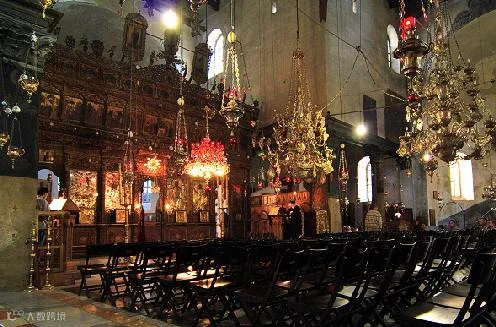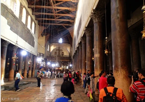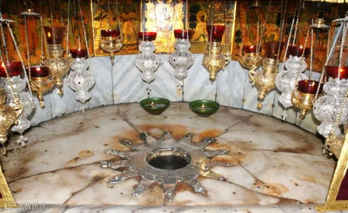 从山脚沿盘山公路上行2公里便到马槽广场,著名的圣诞教堂就在广场左侧。教堂不设大门,只有一米多见方的石洞,人们必须躬身而入。教堂内光线昏暗、烛光摇曳,许多颂扬耶稣和圣母的画像颜色深暗,年头久远。教堂祭坛右侧是圣诞星洞入口,狭窄弯曲而神秘。游客点着蜡烛拾阶而下,就会发现星洞非常狭小,约3×13米,石阶右侧便是著名的圣诞圣坛。这里有一个用红白大理石围成的半圆,中央镶嵌着14角银星,上书拉丁文“圣母玛利亚的基督耶稣诞生地”。圣坛上悬着15盏基督教各派的长明油灯。对面左侧是耶稣出生后充作摇篮的石马槽。