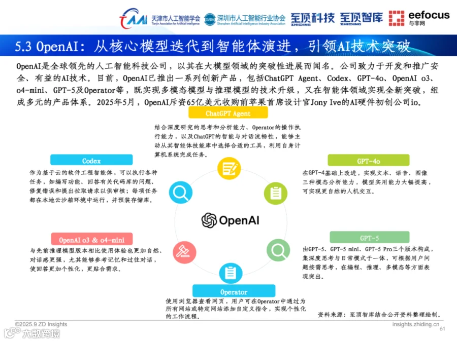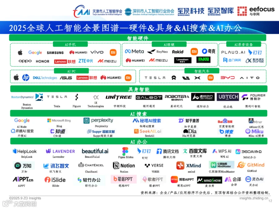 2025 年 AI 产业形成 “应用硬件层 - 模型层 - 基础设施层” 的完整架构,涵盖全球代表性企业、产品与模型: