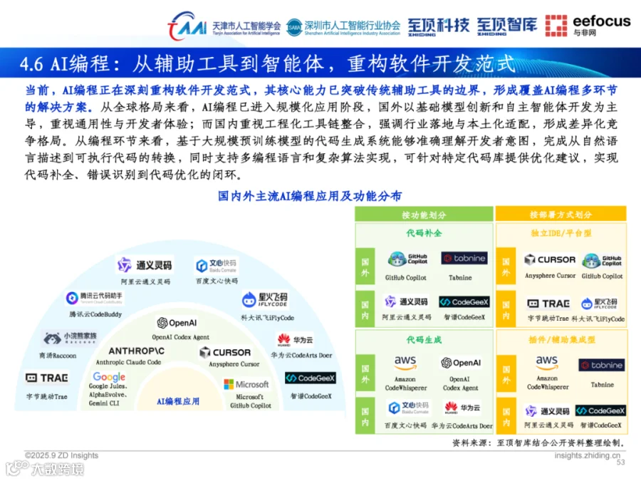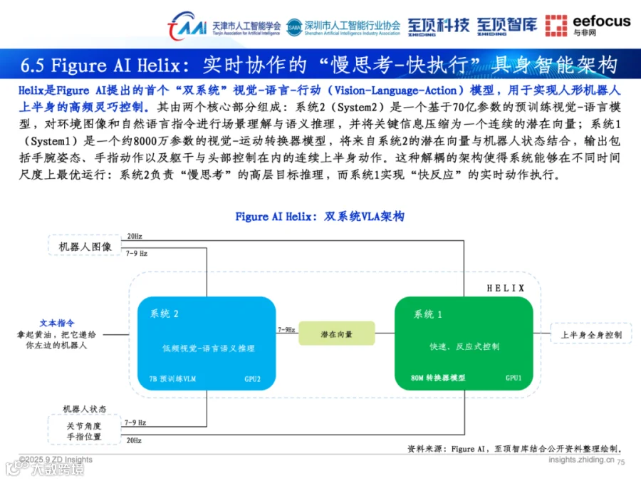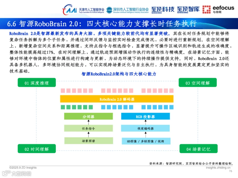 - 具身智能:Figure AI Helix 采用 “双系统架构”(System2 慢思考 + System1 快执行),智源 RoboBrain 2.0 强化长时任务规划与空间理解,推动 AI 从虚拟走向物理世界。