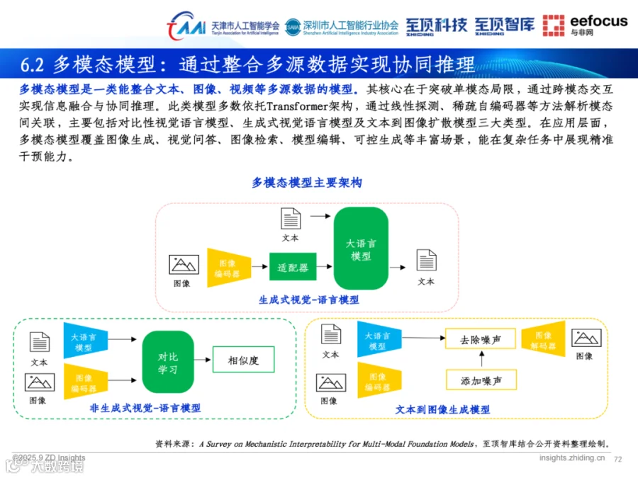 - 多模态模型:整合文本、图像、视频等数据,通过对比性 / 生成式视觉语言模型实现协同推理,覆盖图像生成、视觉问答等场景;