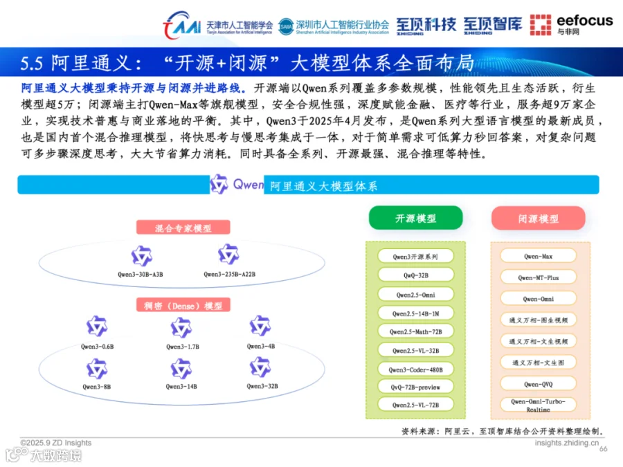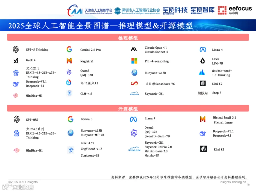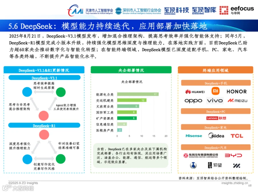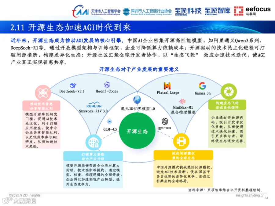 中国 AI 企业成为开源主力:阿里通义 Qwen3 系列、DeepSeek-R1/V3.1、智谱 GLM-4.5 等模型开源,Hugging Face 汇聚超 6000 个可部署模型,形成 “开发者协作 - 技术迭代 - 生态完善” 的飞轮效应。开源不仅降低中小企研发门槛,更挑战海外闭源霸权,推动全球 AI 生态差异化竞争。
