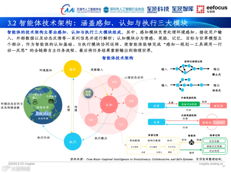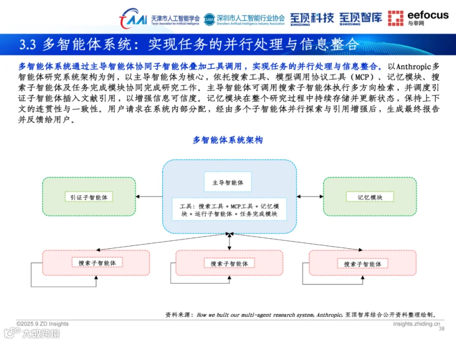 智能体由 “感知 - 认知 - 执行” 三大模块构成:感知层解析用户输入与环境数据,认知层整合情感、记忆、世界模型等要素,执行层完成 “规划 - 工具调用 - 反思 - 行动” 全链路。多智能体系统(如 Anthropic 研究系统)则通过 “主导智能体协同子智能体” 实现任务并行处理,提升信息整合效率。