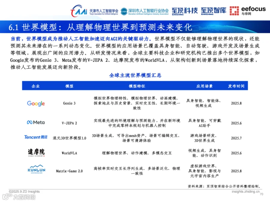 - 世界模型:从 “理解物理世界” 到 “预测未来变化”,如 Google Genie 3 模拟物理特性、阿里混元 3D 世界模型支持场景编辑,自动驾驶是核心落地场景;