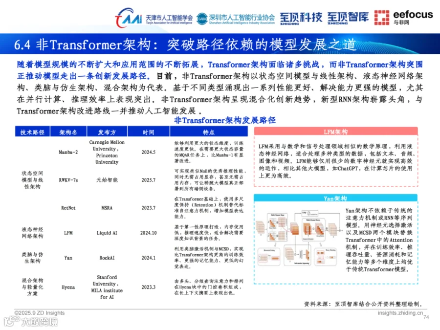 - 非 Transformer 架构:Mamba-2 提升训练速度、RWKV-7s 实现端侧稀疏部署、液态神经网络(LFM)低内存高效推理,突破传统架构局限;
