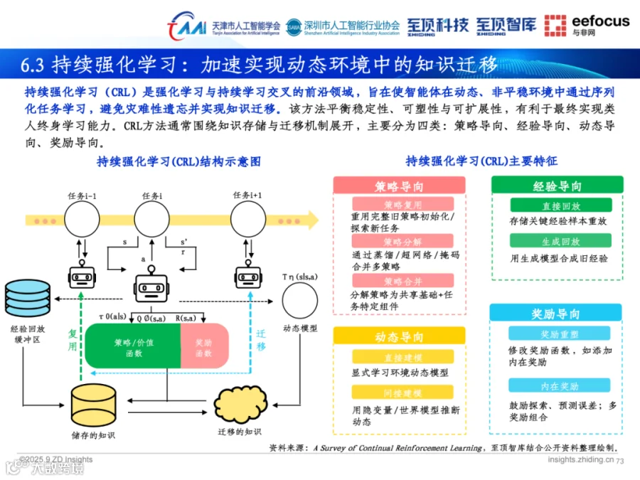 - 持续强化学习(CRL):让智能体在动态环境中避免 “灾难性遗忘”,通过策略复用、经验回放等机制实现知识迁移;