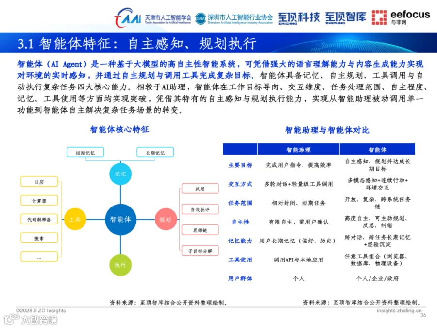 智能体(AI Agent)是 “自主感知 - 规划 - 执行” 的高自主性系统,区别于传统 AI 助理的 “被动响应”,具备记忆、工具调用、复杂任务闭环执行能力,已渗透通用、行业、企业三大场景。