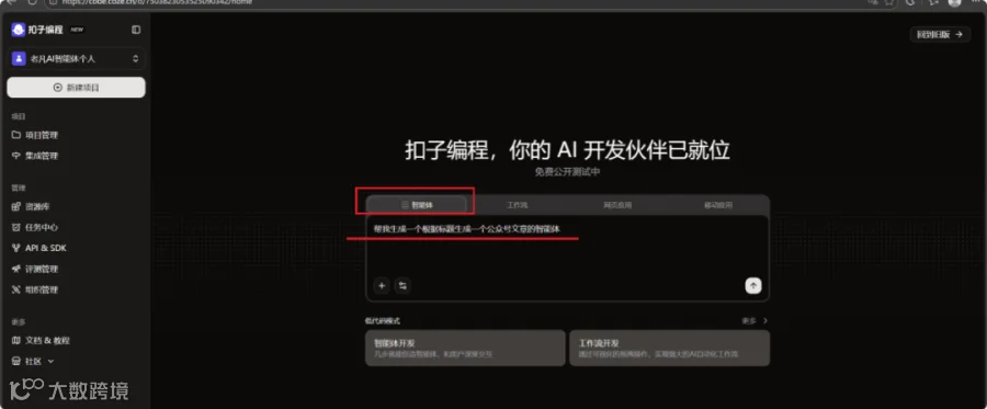 选择智能体,输入内容"帮我生成一个根据标题生成一个公众号文章的智能体"