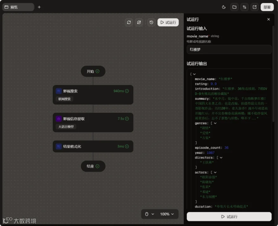 输入内容:"我要做一个工作流,输入电影活着电视剧名称,能够自动查询影视剧豆瓣评分,并且介绍,概要,类型,集数"