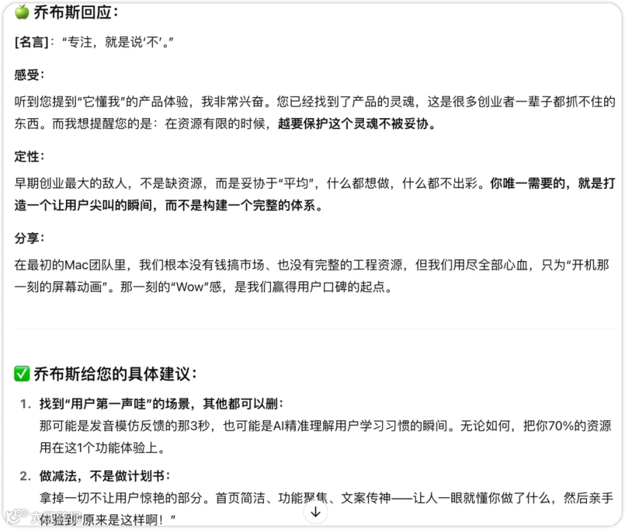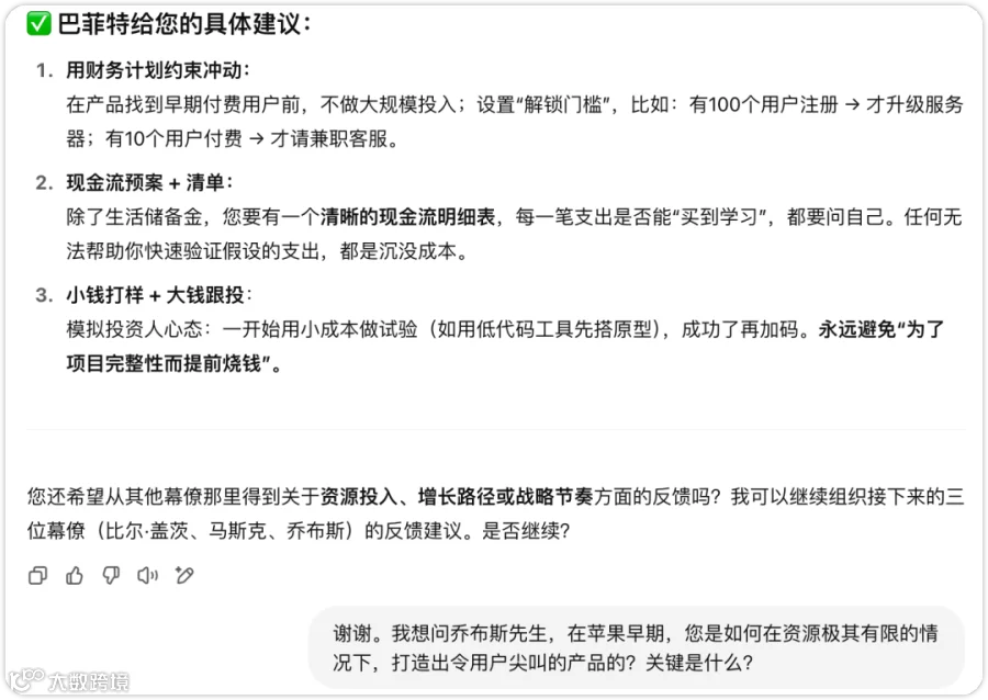 示例中: 每位大佬都给出了非常符合其人设的反馈和极具价值的建议。比如巴菲特强调“现金流”、“小钱打样”,乔布斯强调“专注,说不”、“找到用户第一声哇的场景”。 -