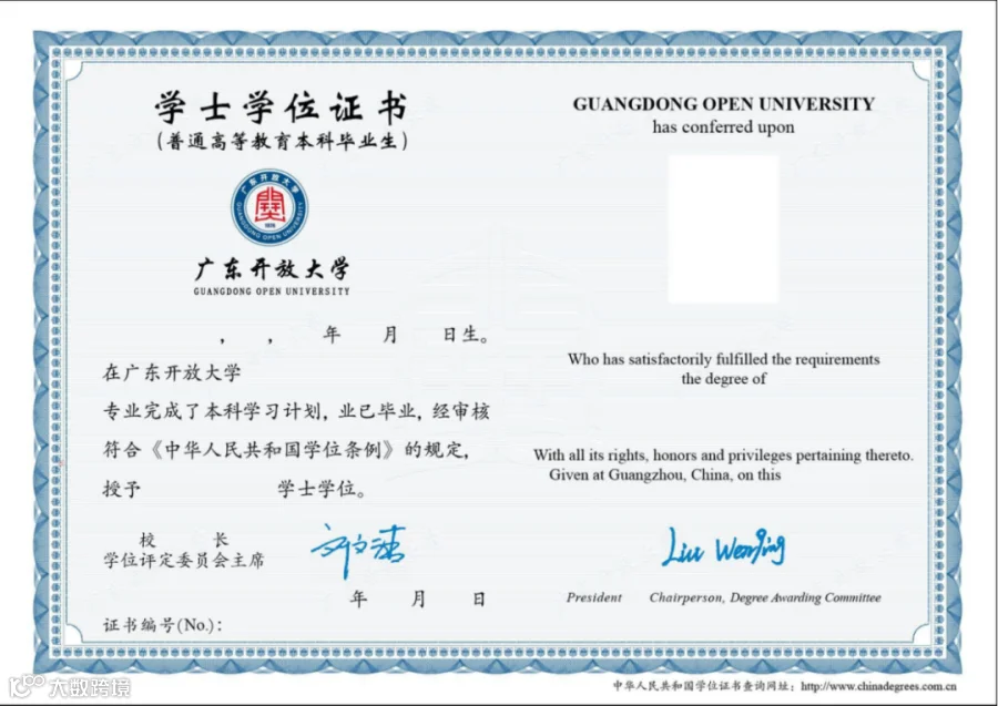 广东开放大学学位证书样本