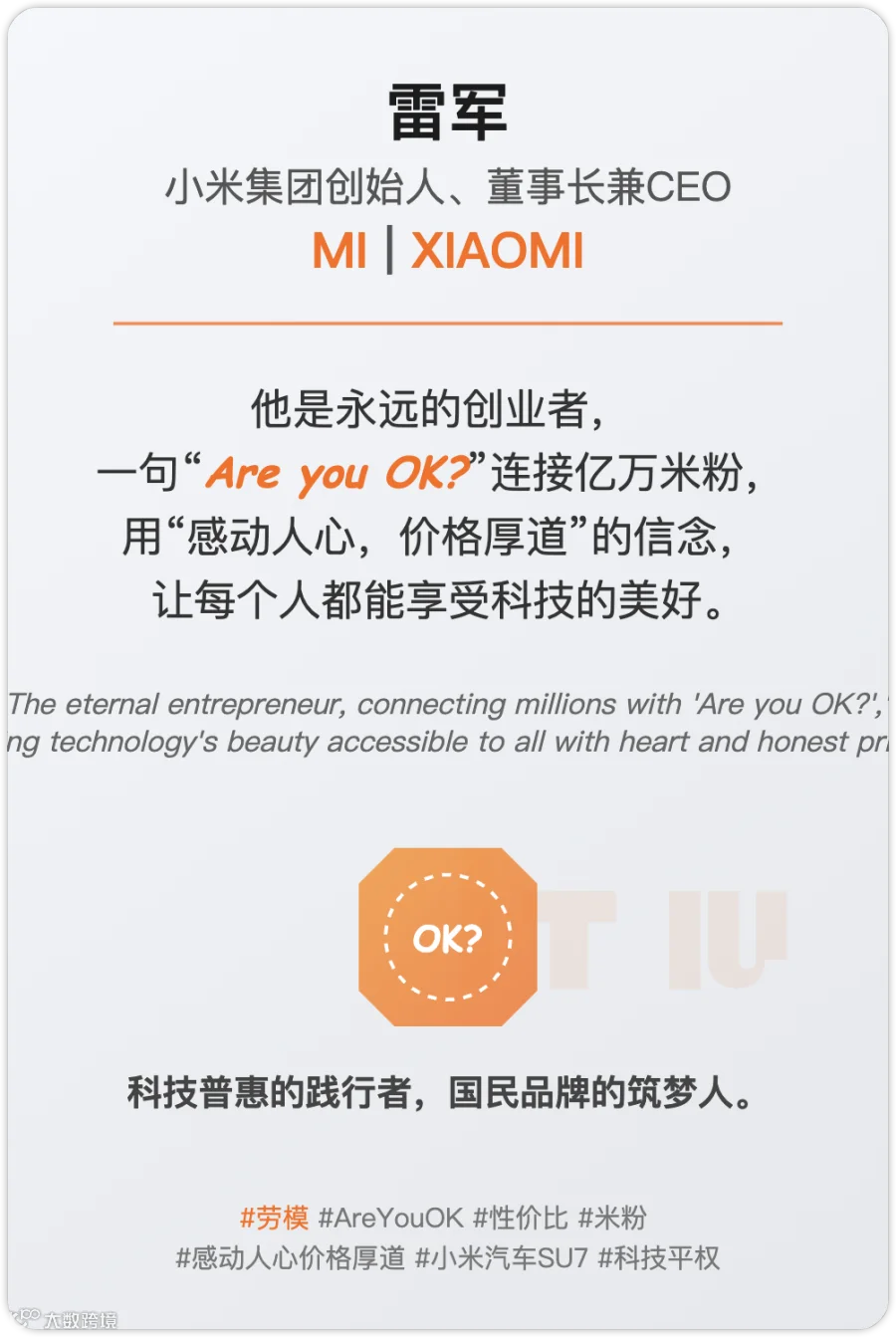 甲木点评:“永远的创业者”点明了奋斗精神,“Are you OK?”是大众记忆点,“感动人心,价格厚道”是核心承诺。非常接地气,又充满了理想主义色彩,这就是雷总的范儿!