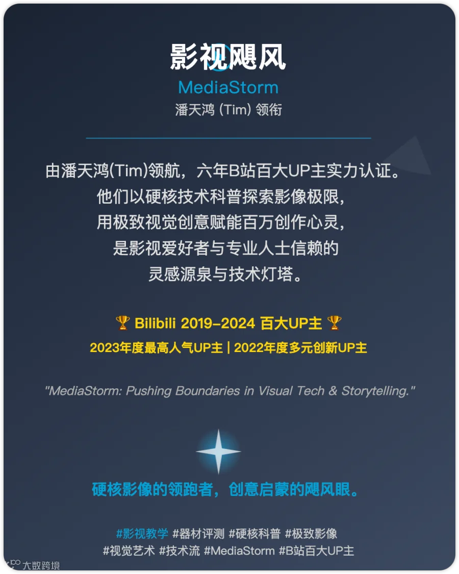 甲木点评:“硬核技术科普”、“极致视觉创意”、“赋能百万创作心灵”、“灵感源泉与技术灯塔”,精准概括了影视飓风在专业领域的核心价值和行业地位。既有实力认证,又有价值输出,非常有力。
