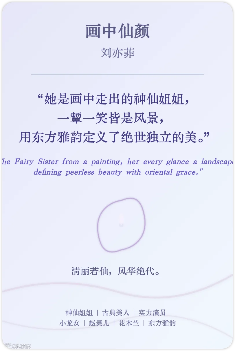 甲木点评:“画中走出的神仙姐姐”、“一颦一笑皆是风景”、“东方雅韵”、“绝世独立的美”,完美诠释了刘亦菲在观众心中那独一无二的“仙气”和古典美。