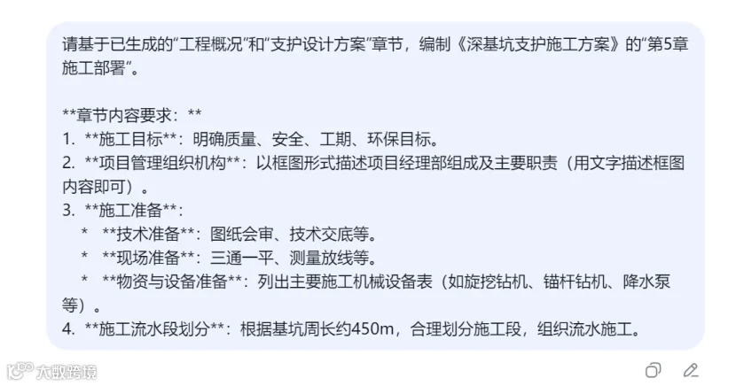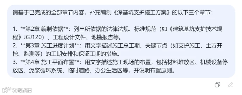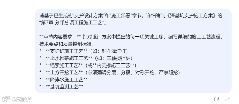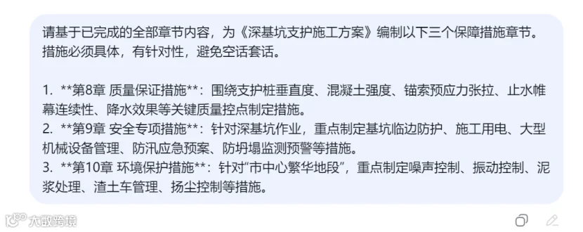 在提示词中引用AI之前生成的内容(如"根据已生成的'工程概况'"),可以帮助AI保持上下文的连贯性,避免方案前后矛盾。