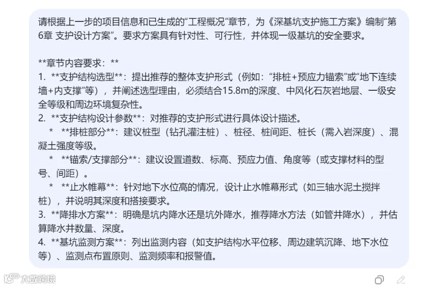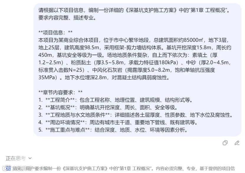 在开始前,请准备好项目的基本信息:工程概况、地质条件、设计要求等。信息越完整,AI生成的方案就越精准。