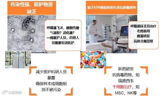 国际权威期刊《柳叶刀》发表的「2019 武汉新型冠状病毒临床特定」阐明,ICU 患者(危重患者)细胞因子和趋化因子的表达水平明显高于非 ICU 患者,细胞因子风暴与疾病严重程度有关。因此,MSC 可能通过降低炎症反应、减少炎性渗出、增强肺泡毛细血管内皮细胞存活率等机制,改善肺部环境,减轻病毒感染患者的病情。