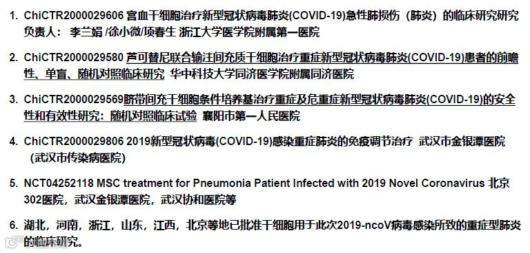 目前,多项关于 MSC 治疗新冠肺炎的临床研究已经开展: