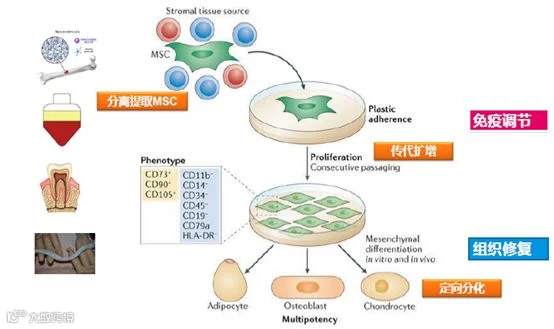 间充质干细胞(Mesenchymal Stem Cells, MSC)是一种多潜能的基质细胞,能够分化为不同类型的细胞,包括成骨细胞、脂肪细胞、软骨细胞、肌细胞、神经细胞等。间充质干细胞在人体中分布广泛,在骨髓、脂肪组织、脐带血、胚盘、外周血、羊水、口腔组织等中都有发现。