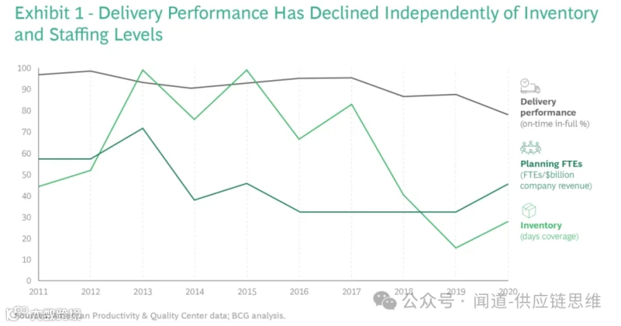 波士顿咨询对2011年至2020年供应链关键绩效指标(KPI)的分析揭示了专家预测趋势的失败:在投入数十亿美元进行数字化转型的同时,交付绩效却持续下降,与库存增加和人员扩充完全脱节。即使公司在COVID-19爆发初期大幅提高库存和人员配置水平,服务质量仍然出现断崖式下跌。这不仅仅是效率问题,而是传统供应链管理模式的系统性崩溃。