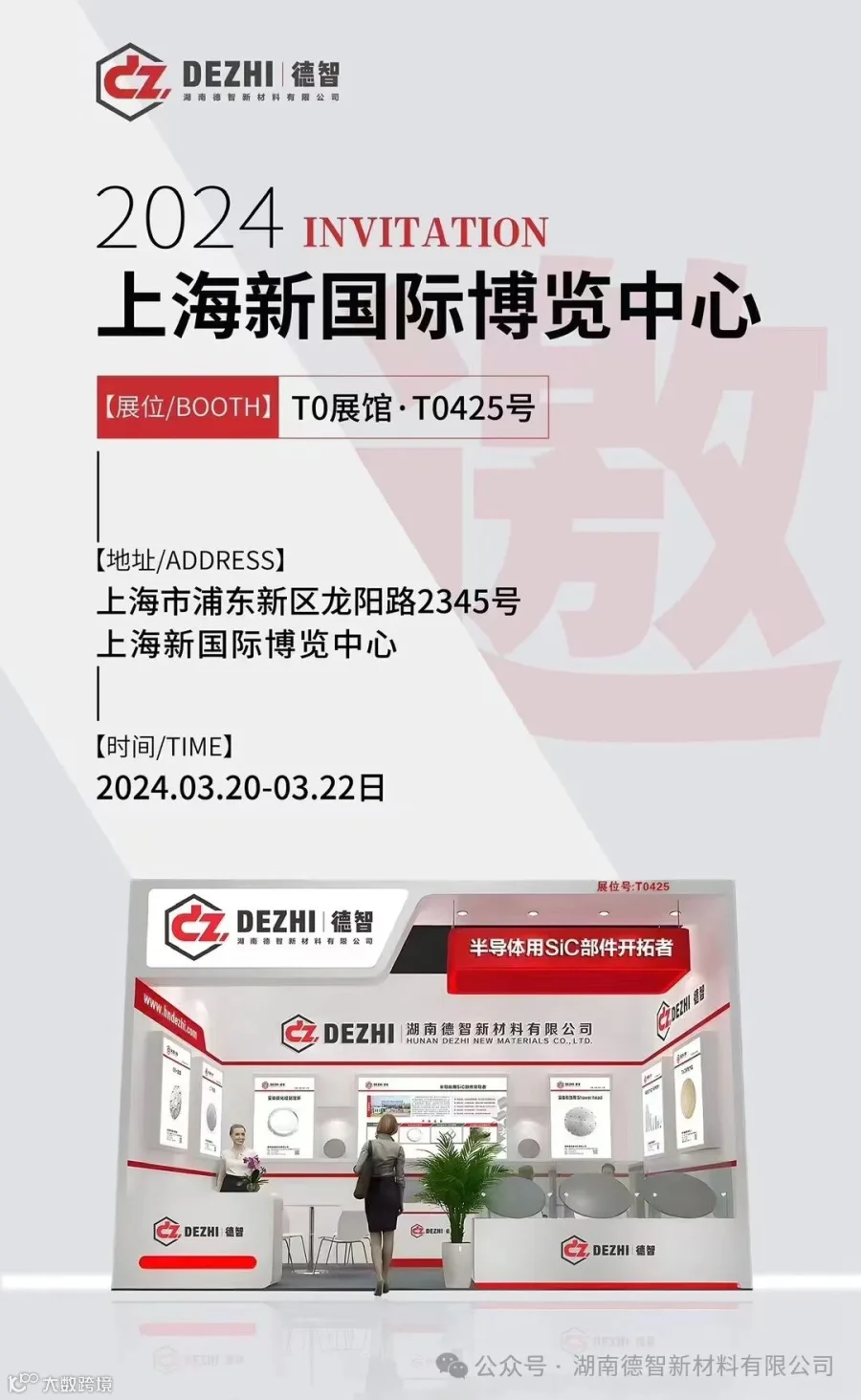 湖南德智新材有限公司诚邀您参加“SEMICON/FPD China 2024”半导体行业盛会!3月20日~3月22日我们将在上海新国际博览中心T0馆T0425展位出展,德智新材——半导体用SiC材料零部件国产化开拓者,提供半导体领域碳化硅石墨配件解决方案。