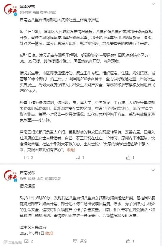 6月2日,津南区人民政府回应称八里台镇局部地面沉降处置工作有序推进,受到影响的主要是碧桂园凤锦庭院小区37、38、39号楼,其他楼相对稳定,周围地表有开裂、沉降现象。现已有序转移涉事楼栋及周边居民2900余人。