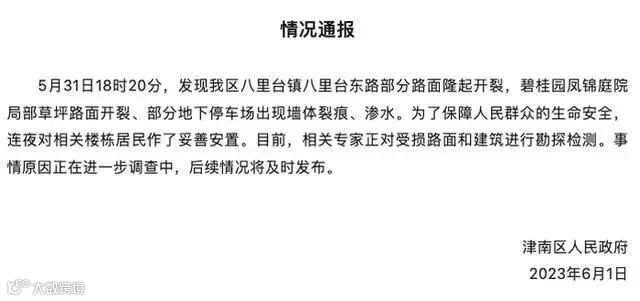 6月1日13时,天津市津南区人民政府发布情况通报,八里台镇八里台东路部分路面隆起开裂,碧桂园凤锦庭院局部草坪路面沉降、部分地下停车场出现墙体裂痕、渗水。