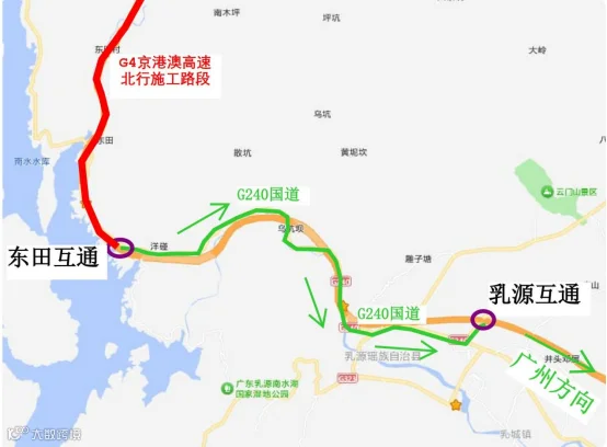 需从东田站驶入京港澳高速往广州方向的车辆可通过G240国道行驶至乳源站进入京港澳高速南行。