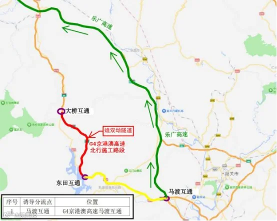 1、驾驶员可提前在京港澳高速马渡互通(K1947)转入乐广高速北行。