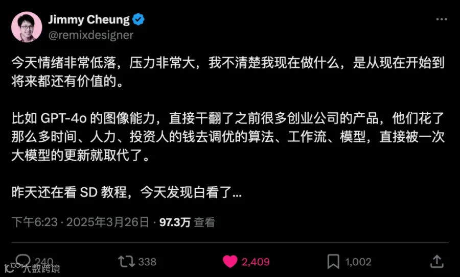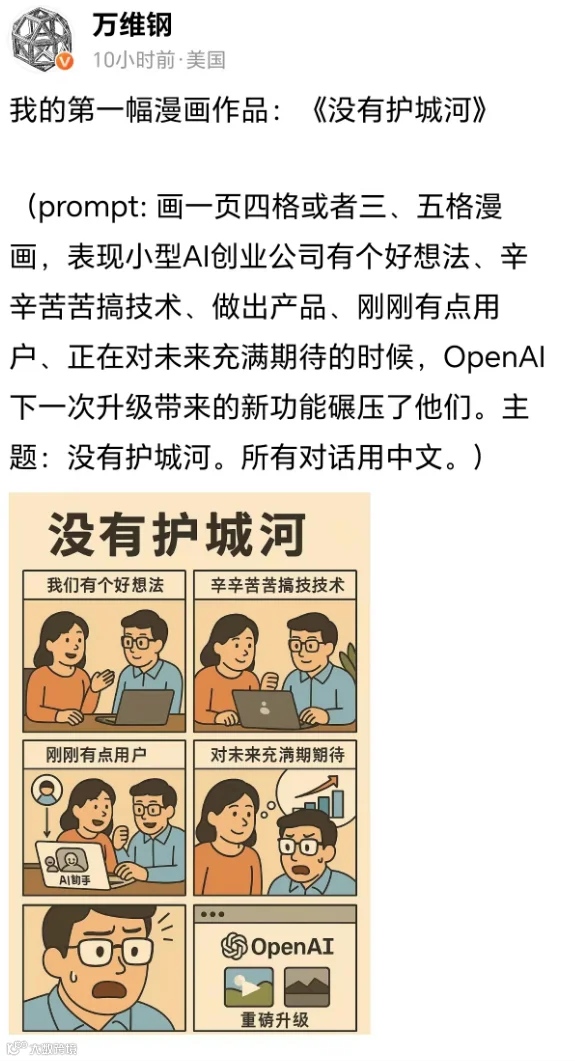 比如,一些专心做AI图片生成的一些中小创业者们。他们可能努力了两三年,结果,OpenAI的一个大更新,就直接宣判了产品死刑。